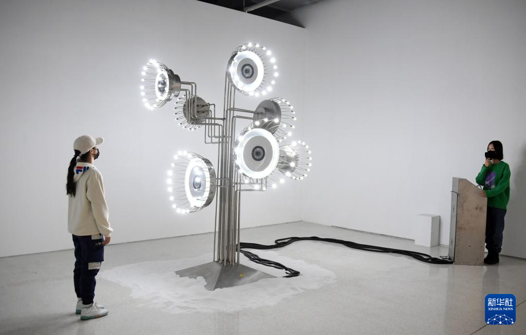 12月14日,在北京时代美术馆,观众参观“向光而行”新媒体艺术展。